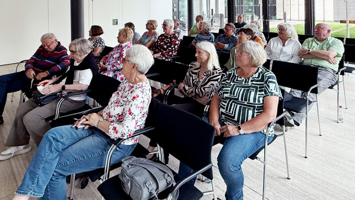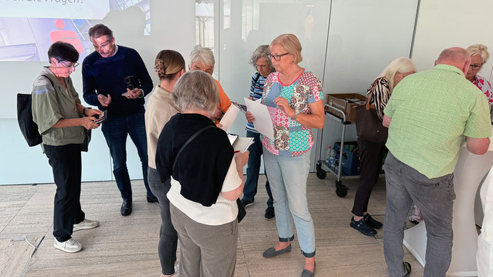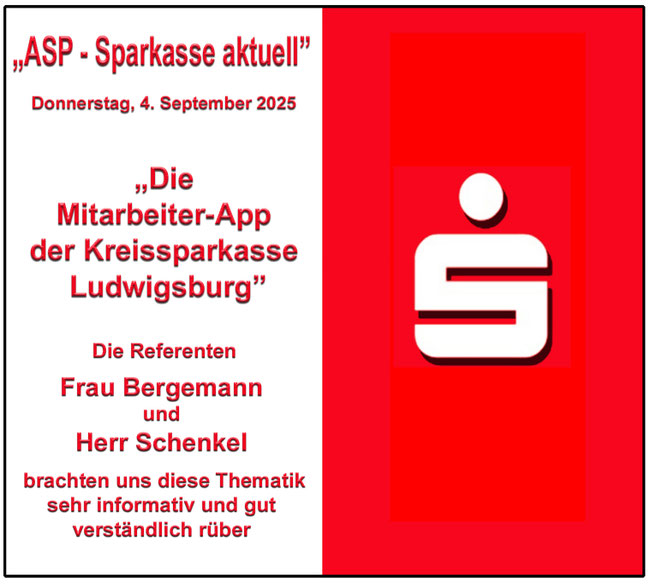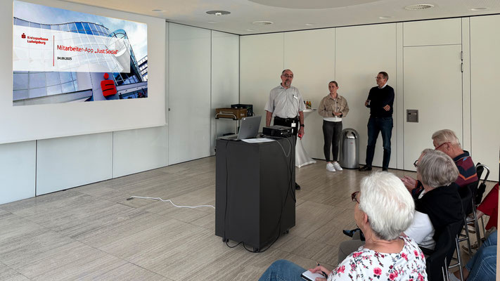 Im Rahmen der Veranstaltung „ASP – Sparkasse aktuell“ fanden sich am 04.09.2025 um 16:00 Uhr 22 ehemalige Kolleginnen und Kollegen im Schiller-Foyer unserer Sparkasse zur Veranstaltung mit dem Titel „Die Mitarbeiter-App der Kreissparkasse Ludwigsburg“ ein. Helmut Rath begrüßte uns alle sehr herzlich und freute sich über unser Kommen. Dann stellte er uns Frau Carina Bergemann und Herrn Matthias Schenkel vor, die uns heute als absolute Experten die Mitarbeiter-App präsentieren werden.
