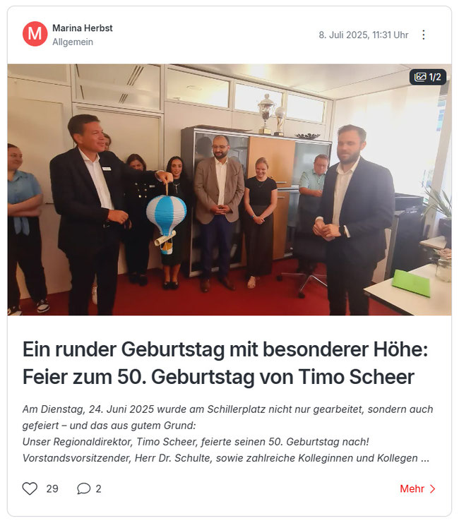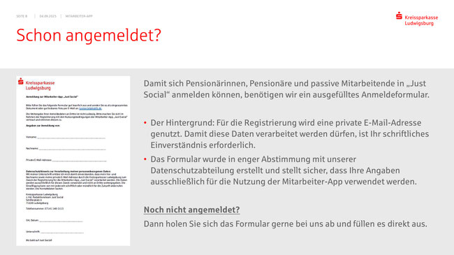 Während viele Unternehmen diese App als Pflicht für alle Beschäftigten eingeführt haben, hat sich unsere Kreissparkasse jedoch dazu entschieden, dies auf freiwilliger Basis einzusetzen. Es gibt also keinen Zwang, sich als Mitarbeiter anzumelden. Trotzdem besteht ein hohes Interesse der Verantwortlichen daran, dass möglichst viele Mitarbeiter dieses interessante Medium nutzen. “Vielleicht können wir heute ja auch noch den Einen oder Anderen begeistern, sich ebenfalls aufzuschalten und mitzumachen.“ Stand August 2025 nutzen bereits 746 Mitarbeitende und Pensionäre die App. Somit haben auch die Pensionäre die Möglichkeit sich zu informieren, was aktuell in der Sparkasse „so abläuft“. Und auch die passiven Mitarbeiter (z.B. Elternzeit, Langzeitkranke usw.) sollen voraussichtlich demnächst die Möglichkeit bekommen, sich aufzuschalten, um dieses interessante Kommunikationsmedium zu nutzen.